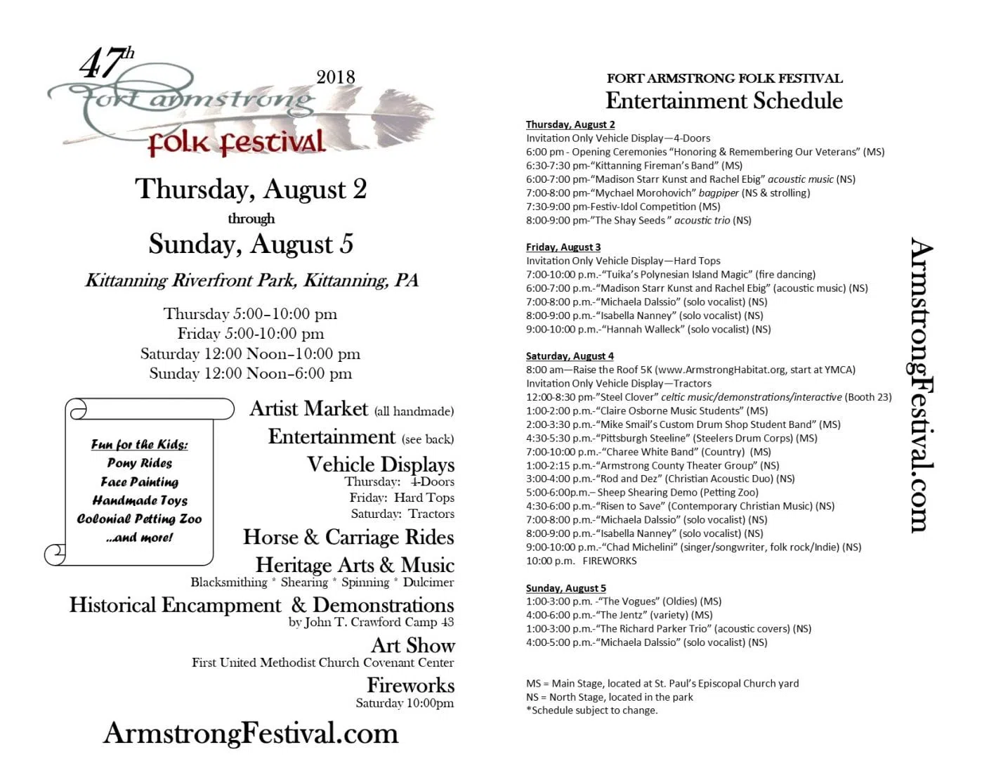 JOIN US at the Fort Armstrong Folk Festival, August 2-5 in Kittanning! Enjoy food booths, entertainment, games and rides for kids of all ages. Check out the full entertainment schedule here on our Fort Armstrong Folk Festival page, brought to you by our corporate sponsor, Tri-Star Ford Kittanning.