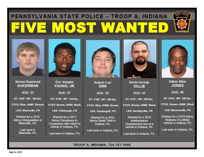 Public Information Officer Trooper Cliff Greenfield said in a news release that Trenton Dwight Jones, who was on the most recent iteration of the list, was found outside of Indiana County and arraigned before district judge Susanne Steffee on April 30th. He was taken to Indiana County jail in lieu of $15,000 bond. Jones, whose last known address was Pittsburgh, was wanted for a 2019 felony theft in Indiana. With his removal, state police have refreshed the list and added some names to it. The five now on the list include: