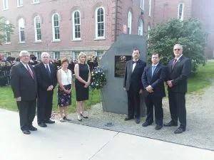 (Standing by IUP’s 9-11 memorial are (from L to R) Indiana County Commissioners Rod Ruddock, Mike Baker and Sherene Hess, Master of Ceremonies Laurie Kuzneski, IUP President Dr. Michael Driscoll, IUP Chief Marketing Officer Chris Noah and IUP Director of Public Safety and Police Keven Thelen. Photo by Josh Widdowson)