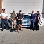 (From L to R: Indiana Borough Police Chief Justin Schawl, Kelly Coleman of Mutts of Merit, PFC Jeff Hoag with Axel, District Attorney Bob Manzi and Assistant District Attorney Gina Force pose with the upgraded K-9 patrol car. Photo by Josh Widdowson)