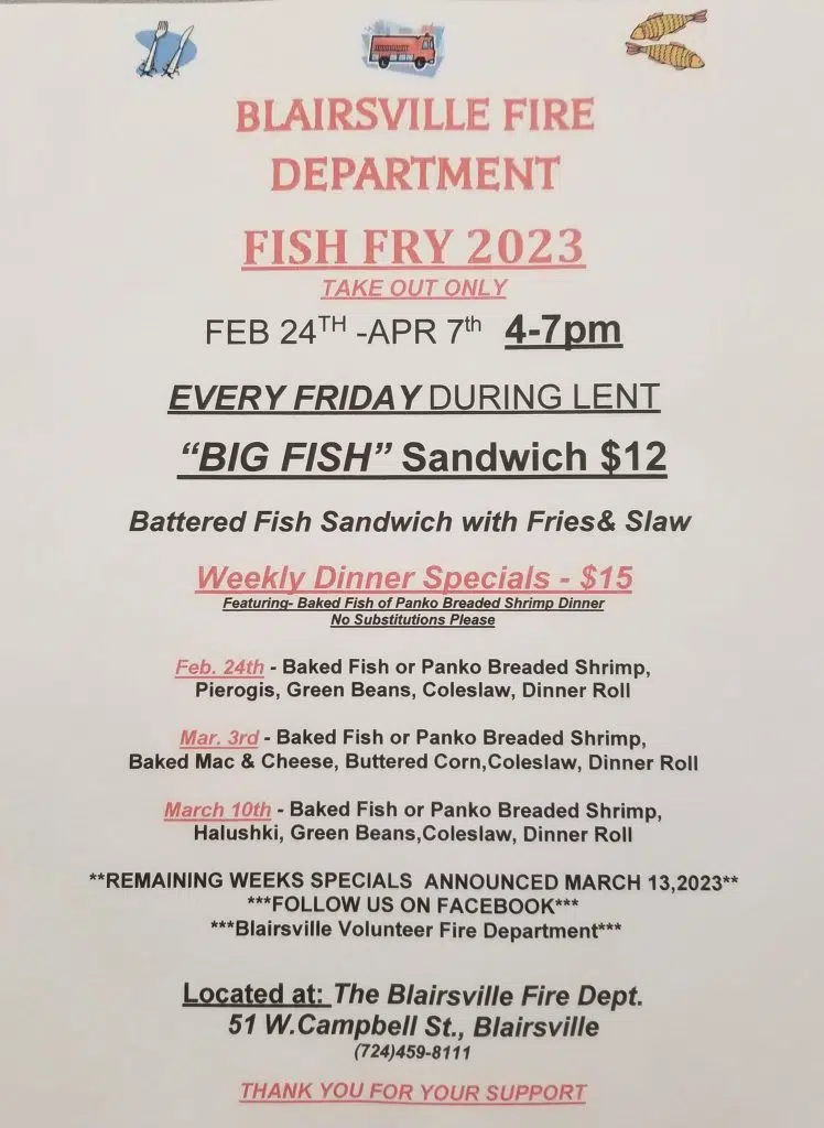 Also returning this year is the Blairsville Volunteer Fire Department’s take-out Lenten fish dinners, which will also run from 4-7 p.m. Weekly dinner specials are available as well as a “Big Fish” sandwich, starting at $12.