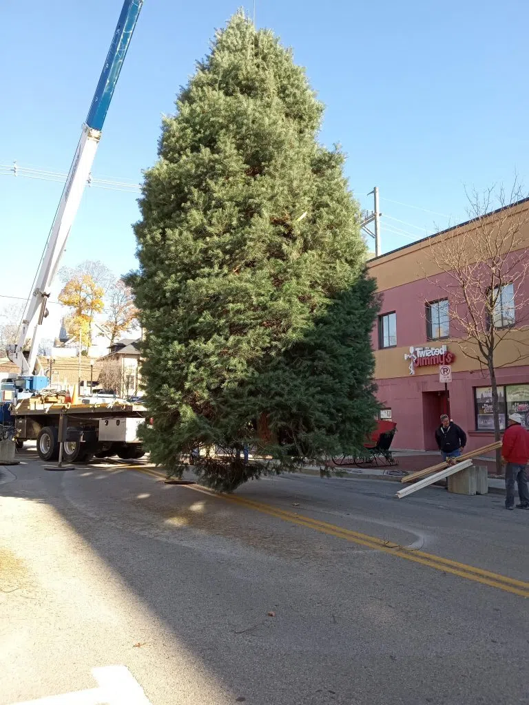 (The 31-foot tall tree hangs on a crane as workers install it at IRMC Park on 7th Street in Downtown Indiana. Photo by Josh Widdowson)
