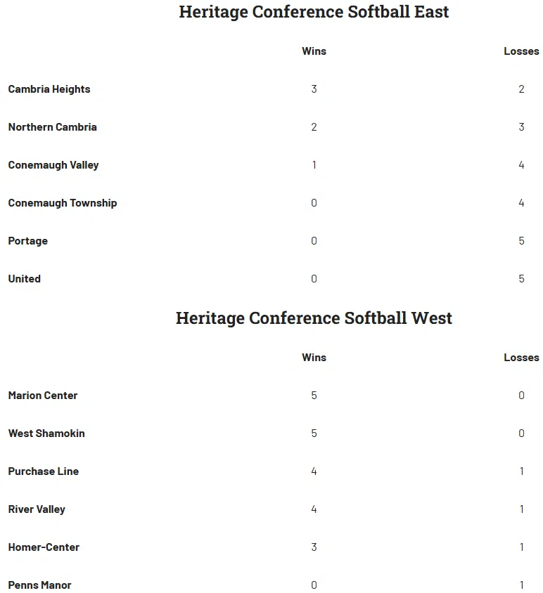 HERITAGE CONFERENCE BASEBALL-SOFTBALL STANDINGS THROUGH APRIL 7