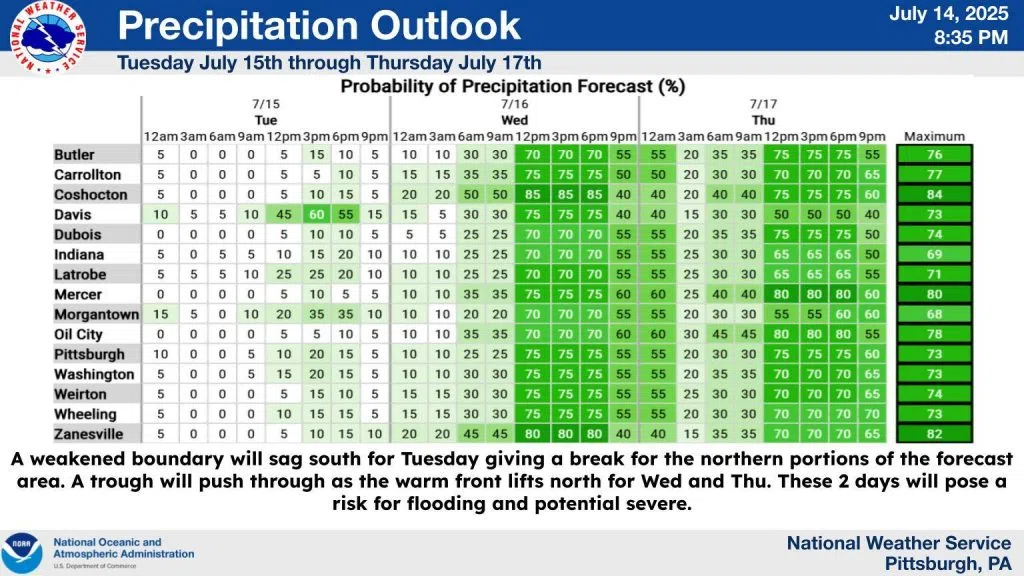 A weakened boundary will sag south for Tuesday giving a break for the northern portions of the forecast area. A trough will push through as the warm front lifts north for Wed and Thu. These 2 days will pose a risk for flooding and potential severe storms.