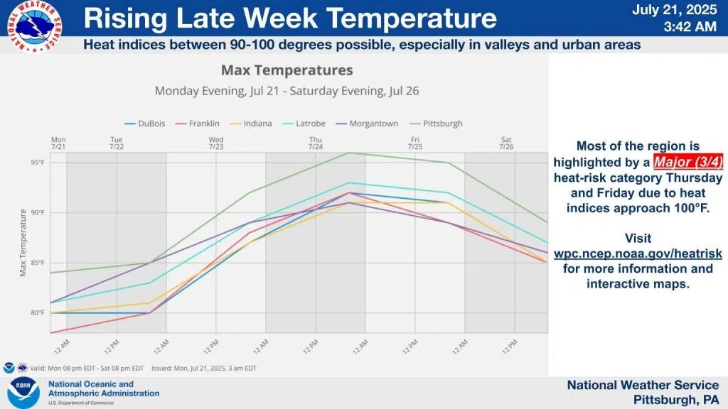 Seasonable temperatures are expected today before temperature rises through the late week period. Many locations could hit 90°F and see heat indices between 90°-100° Thursday and Friday.