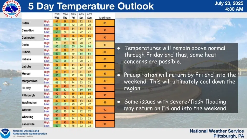 Here are the high/low temperatures through the coming weekend. Some increased heat will be a concern through Friday. Other reports put the high temperature for Thursday at 91 or 92 degrees for Indiana County. The chance of showers and thunderstorms will return Friday but more likely over the weekend.