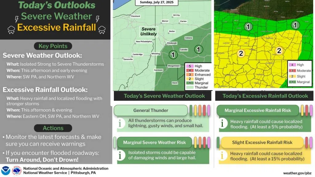 Scattered showers and thunderstorms this morning are expected to become more numerous this afternoon and early evening. There is a Marginal Risk (level 1 out of 5) for severe storms across western PA and northern WV. Locally heavy rainfall could also result in localized flash flooding.
