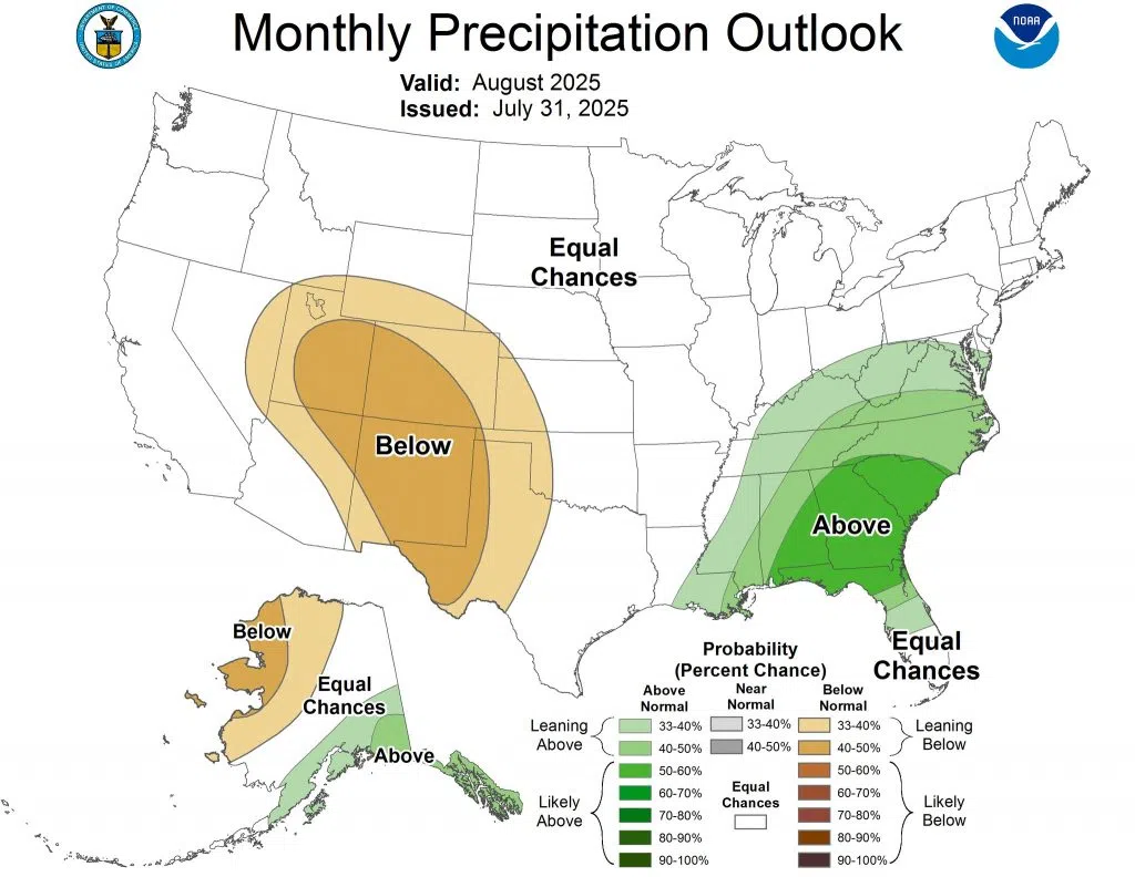 Then here are the latest temperature and precipitation outlooks from the Climate Predication Center for August.
