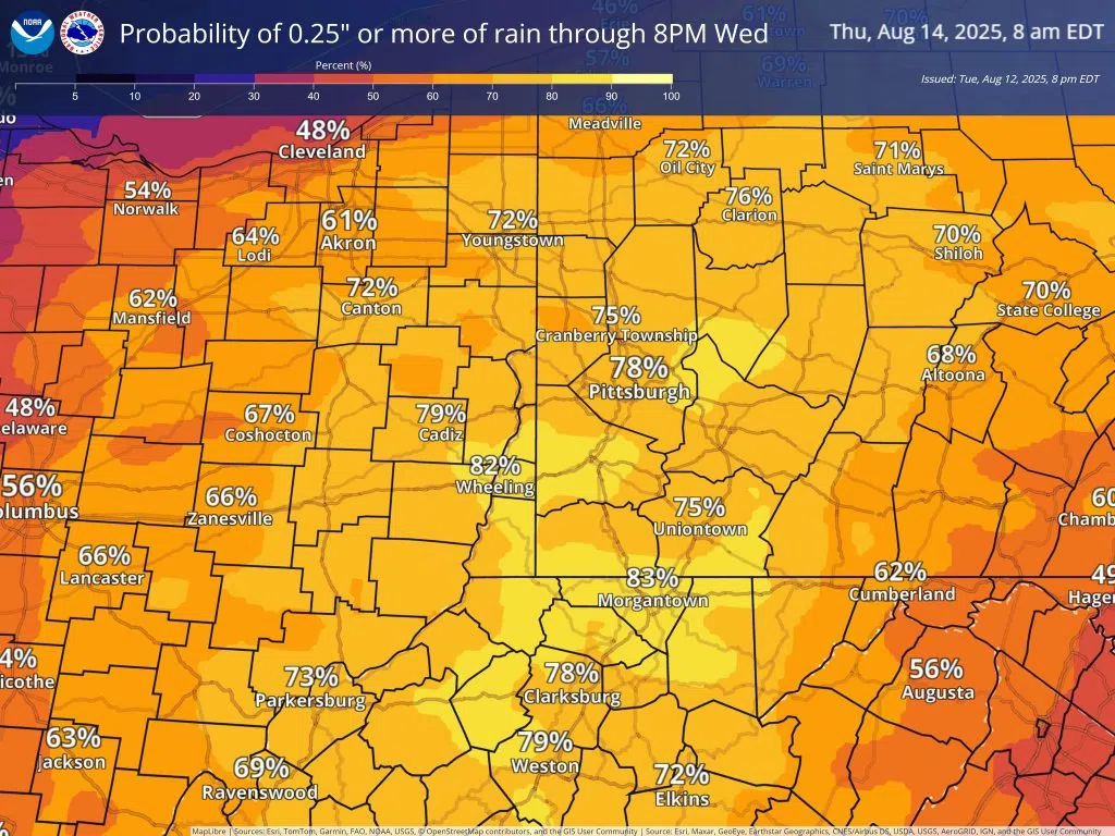 Although a few locations in Ohio and the higher elevations saw rain today, many folks are going on two weeks (or more) since the last round of measurable precipitation. That streak is very likely to end tomorrow! The maps shows chances of getting at least 0.25″ through 8 PM Wednesday.