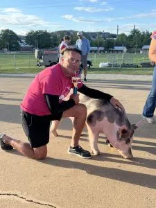 At the Indiana County Fair this evening, Nick Moore of Walbeck Insurance was named the winner of the Evergreen After School Club’s annual “Kiss a Pig” fundraiser.