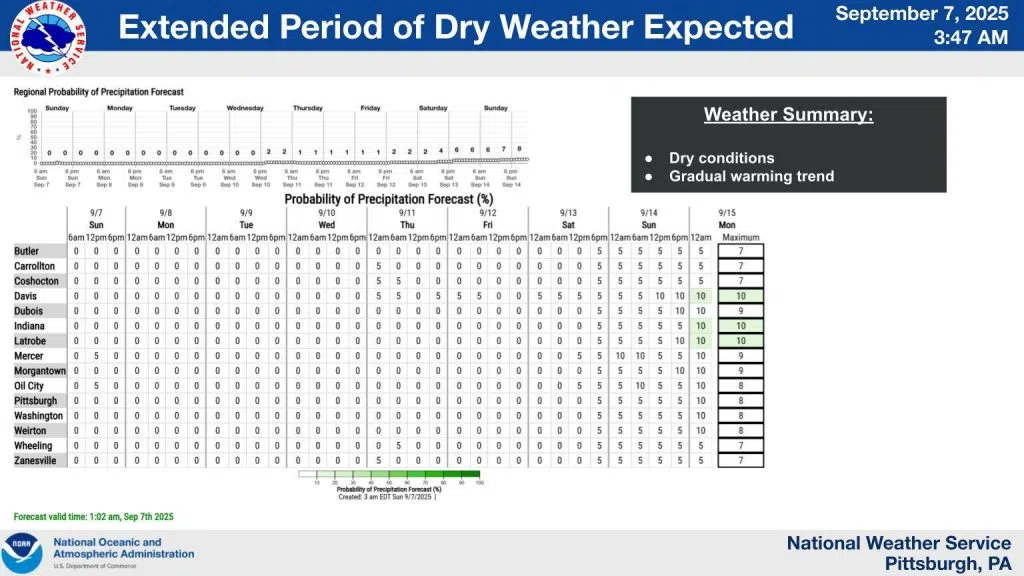 With Indiana County now already categorized as “abnormally dry” and a small portion of the northeast corner of the county listed as in “moderate drought,” conditions are not looking to improve any time soon. Dry conditions and a gradual warming trend (from 10 degrees below normal to normal/slightly above normal) can be expected over the coming week.