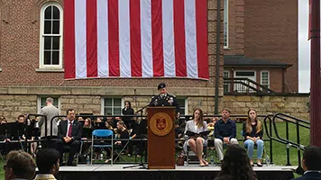 The program featured remarks from Lieutenant Colonel and IUP Professor of Military Science Erich Steffens, President Dr. Micheal Driscoll, and Brigadier General Robin Paul Swan, a retired Pentagon senior executive and IUP class of 1978. It also featured a performance by the IUP Wind Ensemble, under the direction of Timothy Paul.