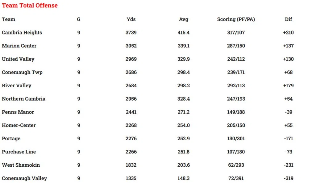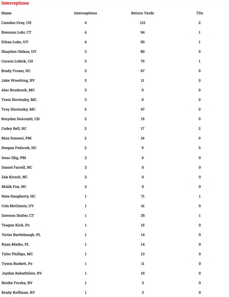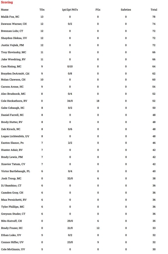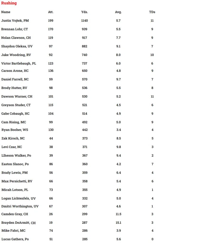 LOCAL HIGH SCHOOL FOOTBALL STATISTICAL LEADERS THROUGH WEEK 9