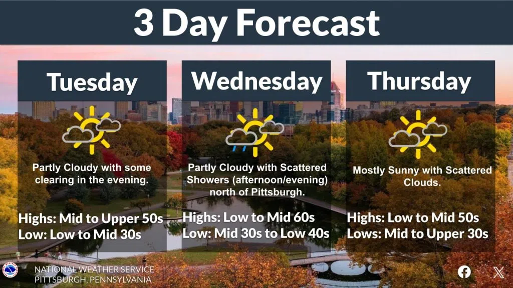 Dry conditions on Tuesday. Light rain chances return Wednesday afternoon and evening mainly for areas north of Pittsburgh. Highs on Wednesday are expected to be above average in the 60s before returning to normal temperatures in the mid 50s.