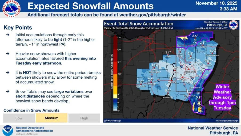 A small portion of the southeastern corner of Indiana County is under a Winter Weather Advisory through 1 pm on Tuesday.