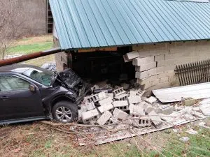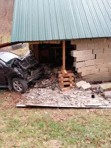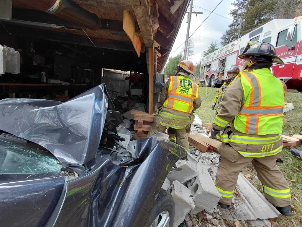 This happened around 11:15 AM. Fire officials said that an SUV went off the road and hit a garage, causing severe damage to both structure and vehicle. The driver, identified only as a juvenile, was taken to Indiana Regional Medical Center for treatment of injuries. The garage needed to be stabilized so crews could remove the vehicle.