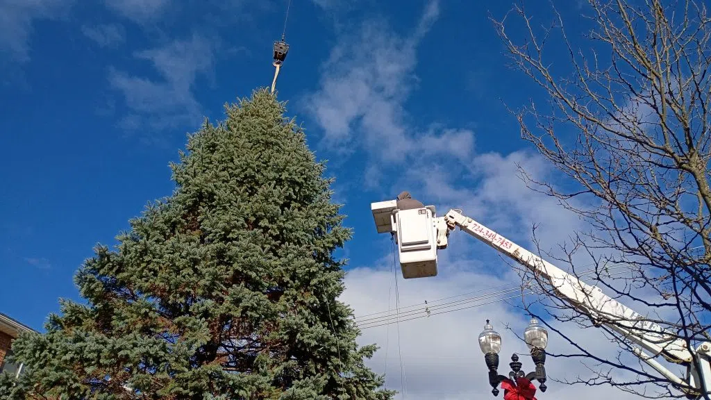 (Workers from Don Huey help put the 40-foot tall tree in place at IRMC Park. Photo by Josh Widdowson)