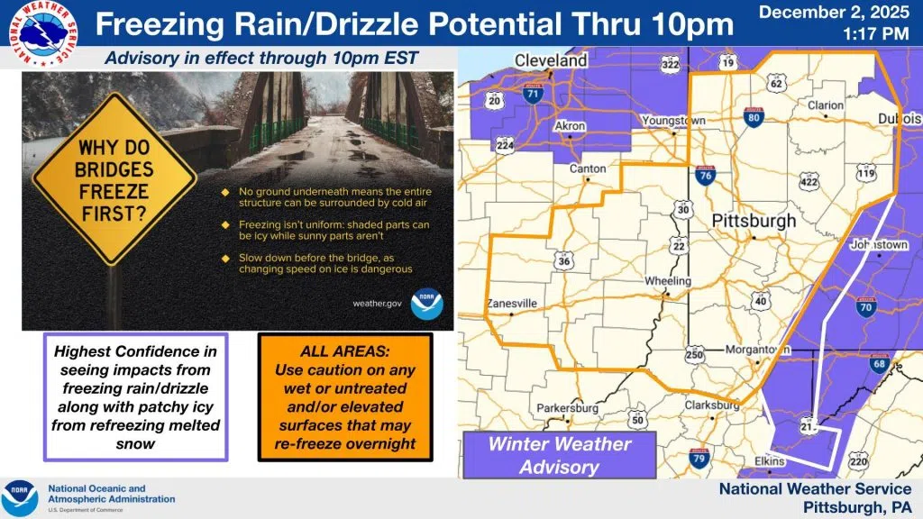 The Winter Weather Advisory has been extended for the higher elevations south/east of Pittsburgh where occasional freezing rain/drizzle may lead to light ice accumulations. For those areas AND elsewhere, falling temperature overnight may allow for wet roads (from melting snow) to re-freeze if untreated.