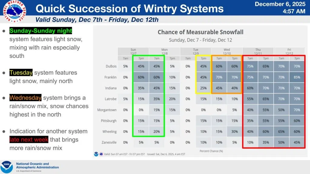 The active pattern continues across the region as several quick hitting systems are expected to bring varying snowfall across the region late this weekend and into next week. The first few of which are likely to feature light snowfall mainly north of Pittsburgh. Indications for a more intense wintry system exist late next week but it remains early in the forecast cycle to pin down exact details.