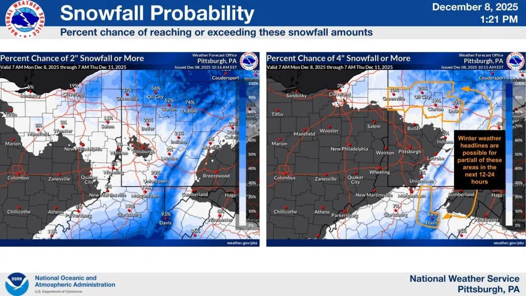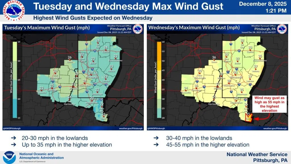 A system will move through Tuesday night – Thursday morning and bring an inch or less of snow for most, but more notable accumulation is more likely in the ridges and north of Pittsburgh.