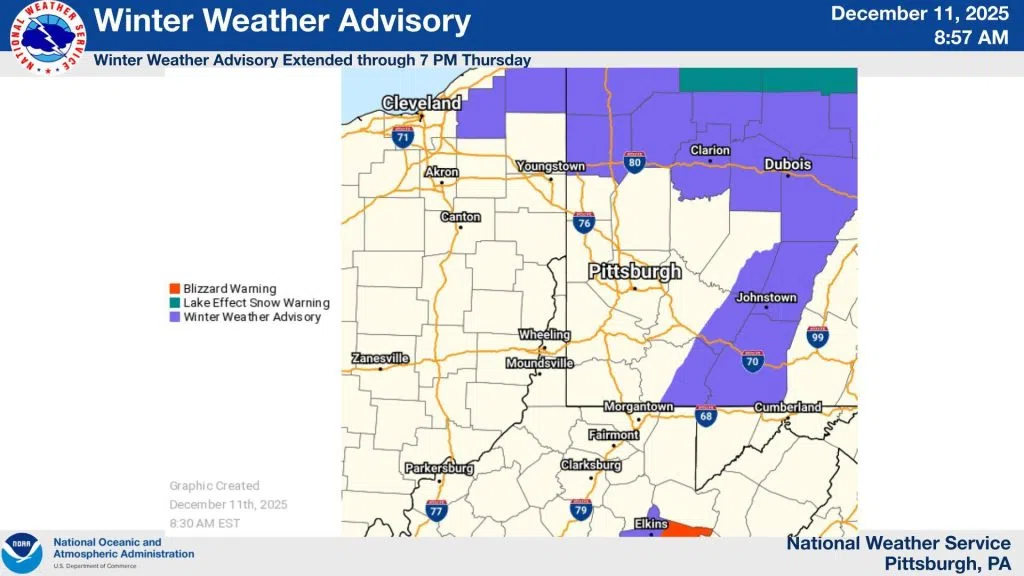 The Winter Weather Advisory has been extended through 7 PM for areas along and north of I-80 and in the ridges where lake effect snow will persist. Elsewhere, localized bands of snow could create hazardous travel this morning.