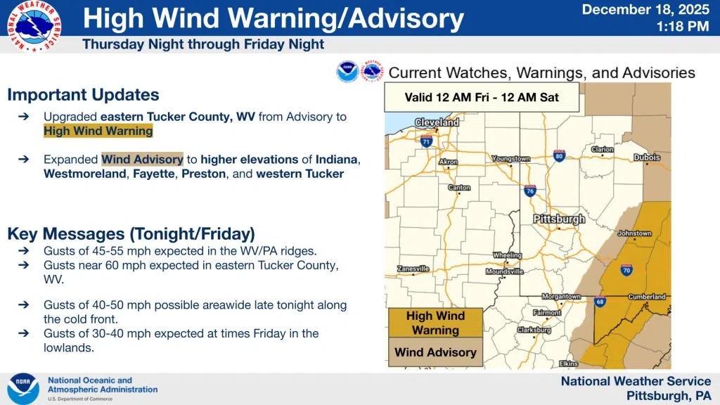 Probability has increased for gusts up to 50 mph in the Laurels and Allegheny Mtns tonight and Friday where a Wind Advisory has been issued. Gusts near 60 mph are expected in eastern Tucker County, WV where a High Wind Warning is in effect tonight through Friday night.