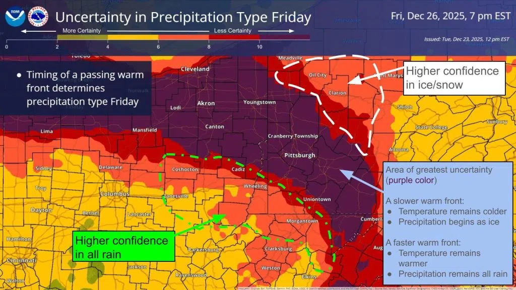 A storm on Friday looks to bring wintry impacts across the region. Uncertainty in precipitation type still exists in the purple area, including the Pittsburgh metro, however impacts from ice look possible north and east of Pittsburgh. This system will impact holiday travel. Check back for more details.