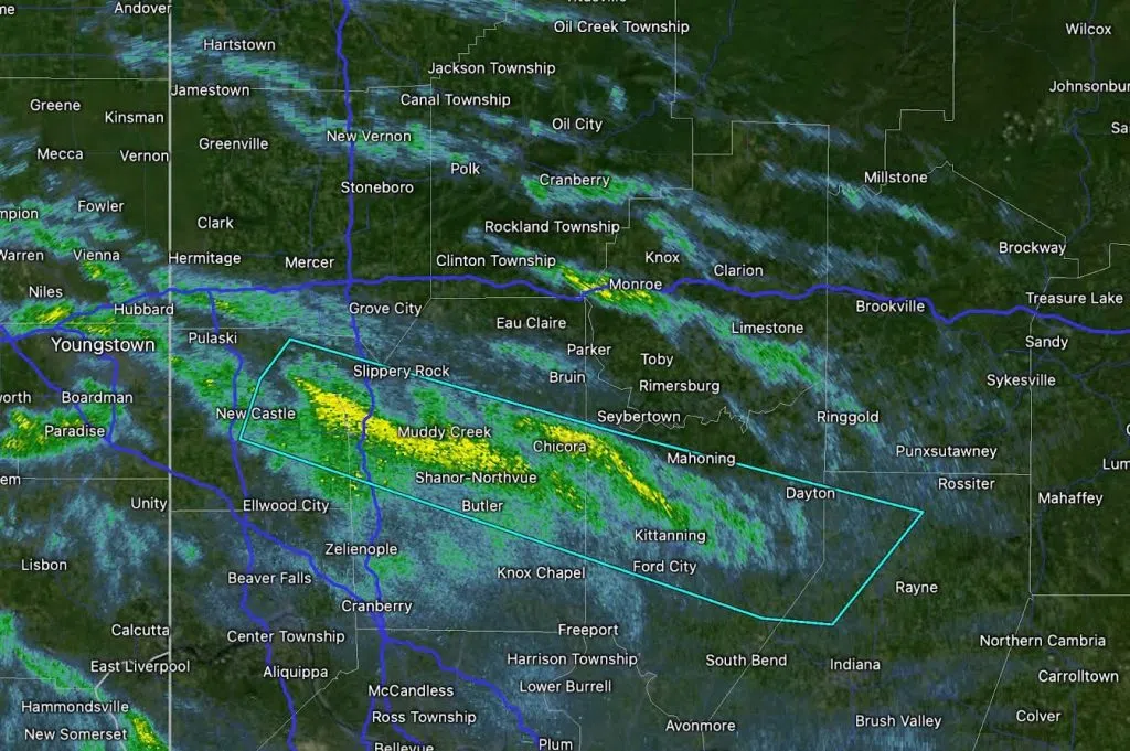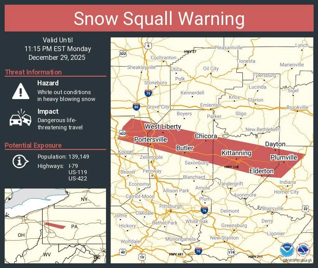 A new Snow Warning is in effect until 11:15 PM. Heavy, intense snow is moving southeast over parts of Lawrence, Butler, Indiana, and Armstrong counties.
