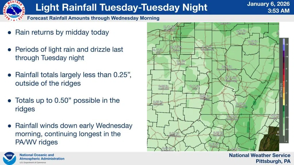 Rainfall returns to the region today. Overall accumulations are expected to be rather light, with most areas seeing less than 0.25″. The best chance for rain in Indiana County begins around 5 pm at about 60 percent. Rainfall begins to wind down early Wednesday morning.
