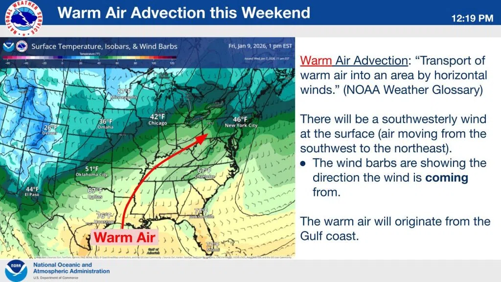 From Thursday to Saturday, we continue to expect a warm-up with highs in the upper 50s and lower 60s across most of the region. How will temperatures get this warm? Not through sunshine. Overcast skies are expected through parts of tomorrow as well as all day Friday/Saturday. The main driver for this change will be warm air advection.