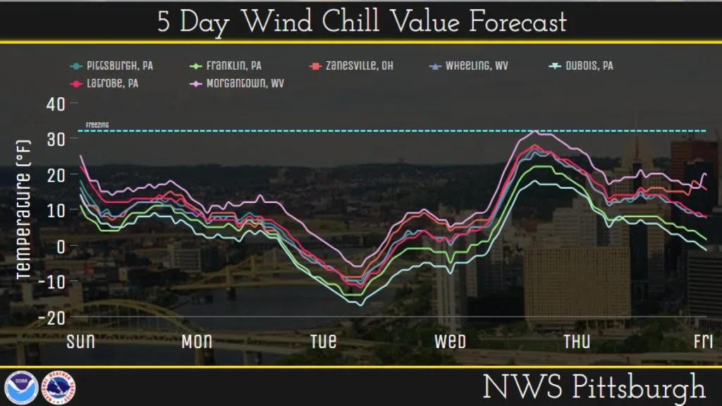 While temperatures will be around 10 degrees below normal today, another front on Monday will usher in even colder temperatures with single digit lows Tuesday morning and highs in the teens on Tuesday. That combined with elevated winds will result in very low wind chill values.