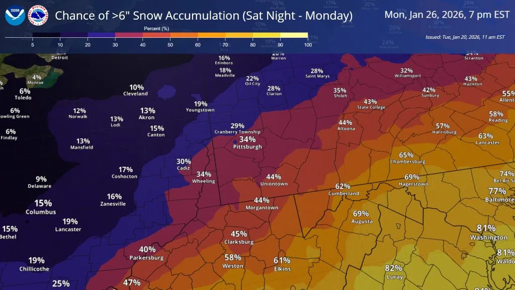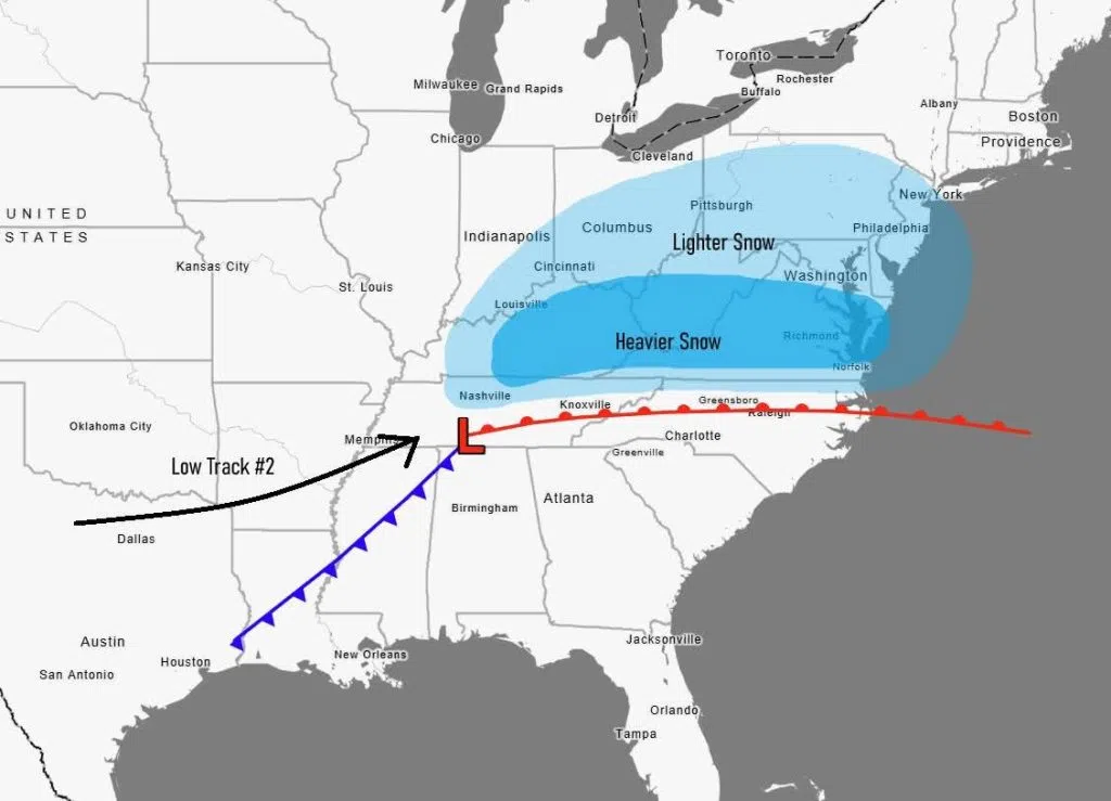 The storm track forms to the south then curves up the spine of the Appalachians before reforming off the coast. In this scenario, the region would see the heaviest snow from the storm. This track would produce heavy accumulations (likely >6″ to as much as 12″). But this scenario is 30% at this time given current weather prediction guidance.