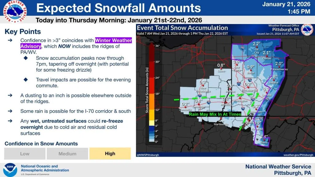 The Winter Weather Advisory has been expanded to include the higher ridges of southeast of Pittsburgh as areas see 2-4″ of snow accumulation through tonight. Be alert to slick spots as sub-freezing temperature could result in re-freezing of wet, untreated surfaces.