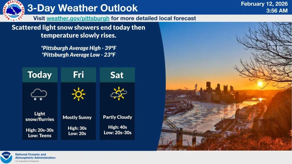 Scattered light snow mainly over western Pennsylvania will taper off today before temperature slowly rises, reaching above normal readings by Saturday.