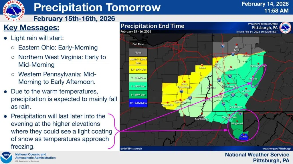 Enjoy the beautiful sunshine today!☀️ Tomorrow, we are expecting overcast skies and some rain due to a low pressure system passing to our south. Precipitation is expected to linger into the evening at some higher elevations where it will likely turn to snow (low probability for measurable accumulation).