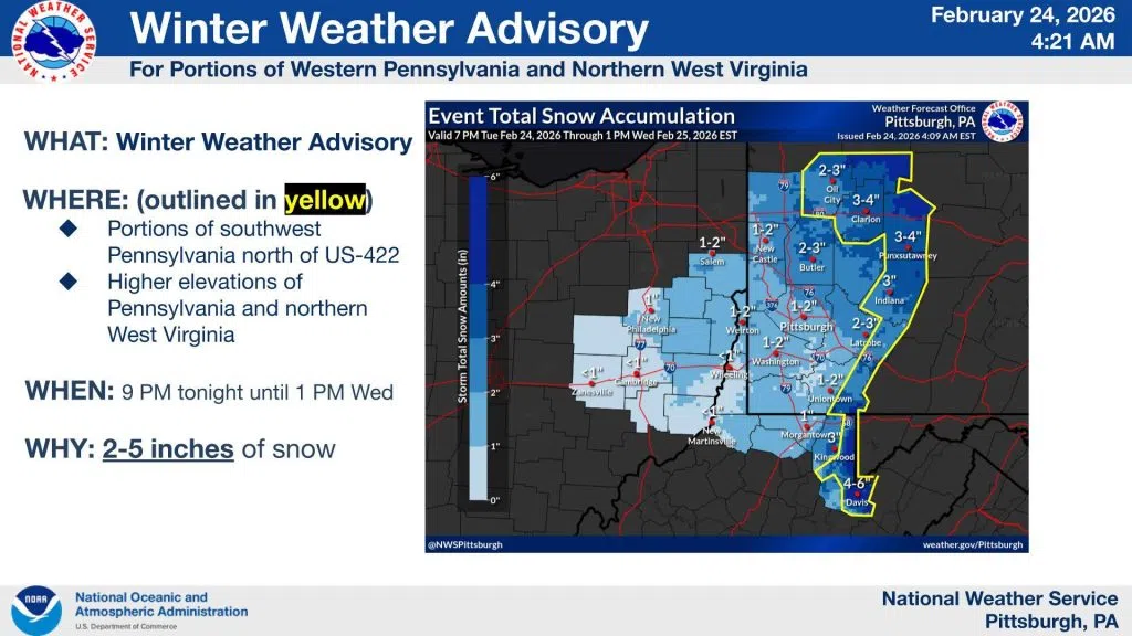 After the morning snow exits, another quick-hitting system will provide a round of fresh snow accumulation tonight into Wednesday morning. A new Winter Weather Advisory has been issued northeast of Pittsburgh and along the ridges for 2-5″ of new snow (possibly locally more on the highest ridges). Check back for updates!