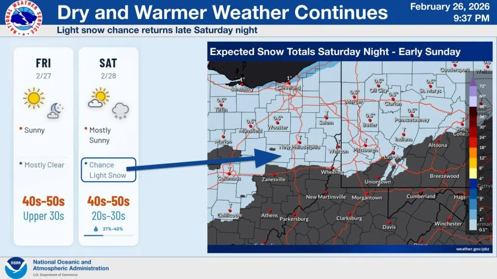 Warmer temperatures to end the week, but winter’s not over yet! Our next light snow chance will be Saturday night into early Sunday. Another more potent system will then cross the region in the Monday/Tuesday timeframe, bringing another chance for snow or rain to the area.