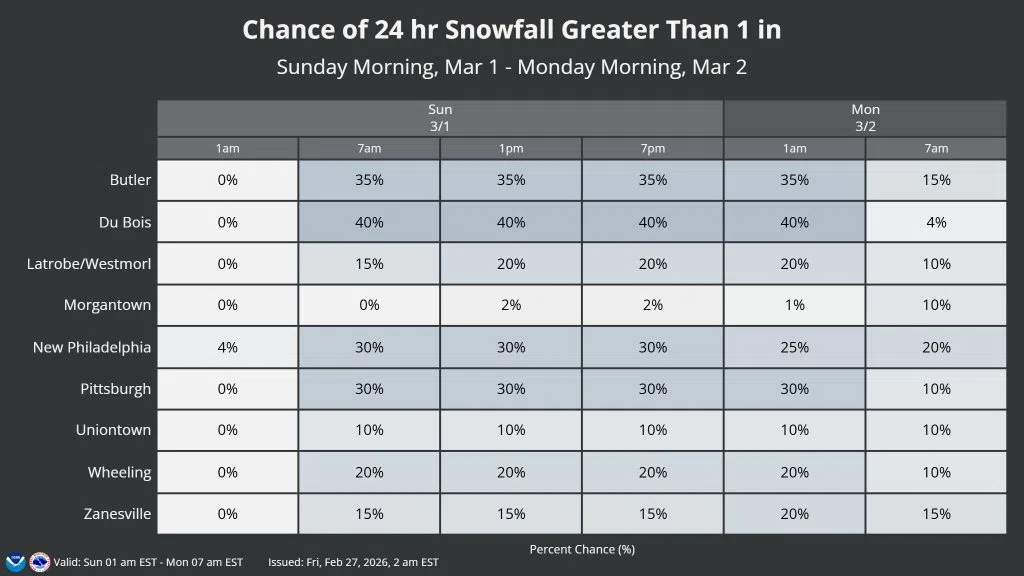 The second graphic shows the probabilities of exceeding 1 inch of snowfall within a 24 hour period. There may be a brief period of freezing drizzle as well Sunday morning.