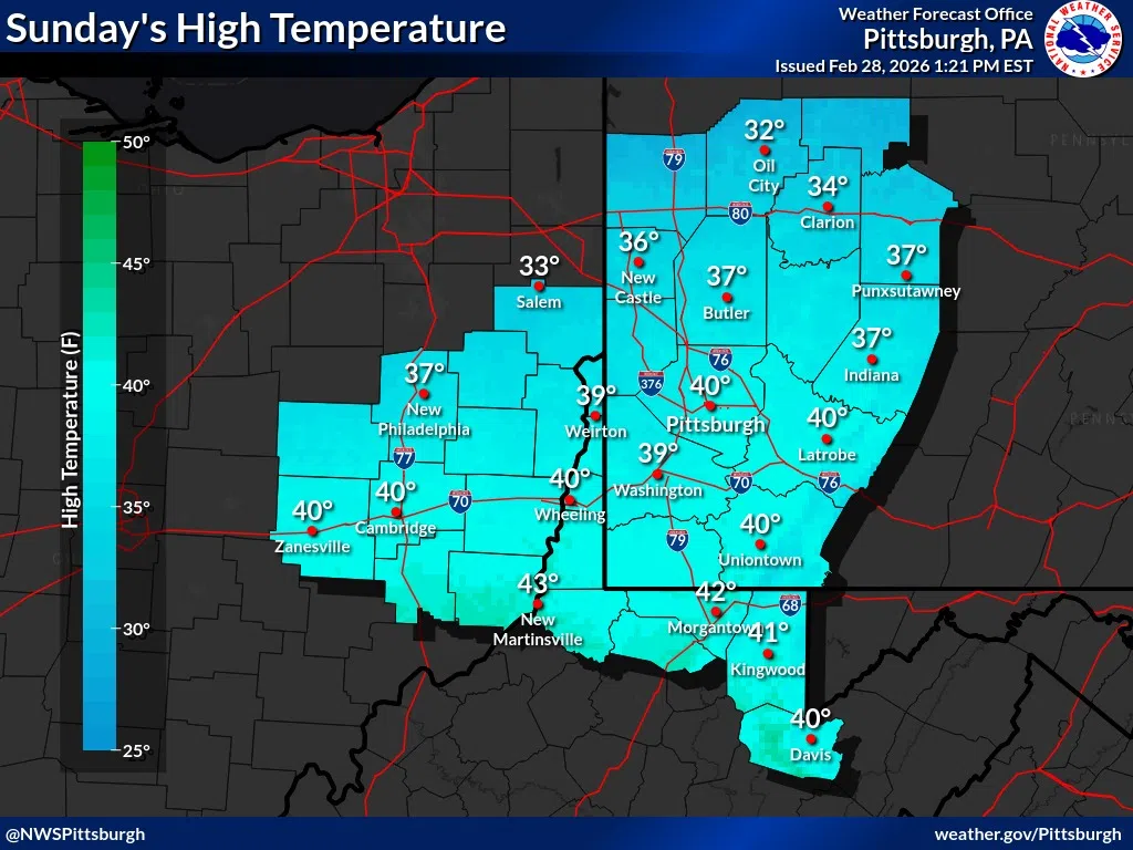 Tonight, a cold front will move through the area which will result in rain or snow for most, however, some could see a little sleet or rain/snow mix. By Sunday morning, the precipitation will end and the skies will clear by the afternoon. High temperatures ranging between the mid 30s to low 40s (about 5 degrees below normal).