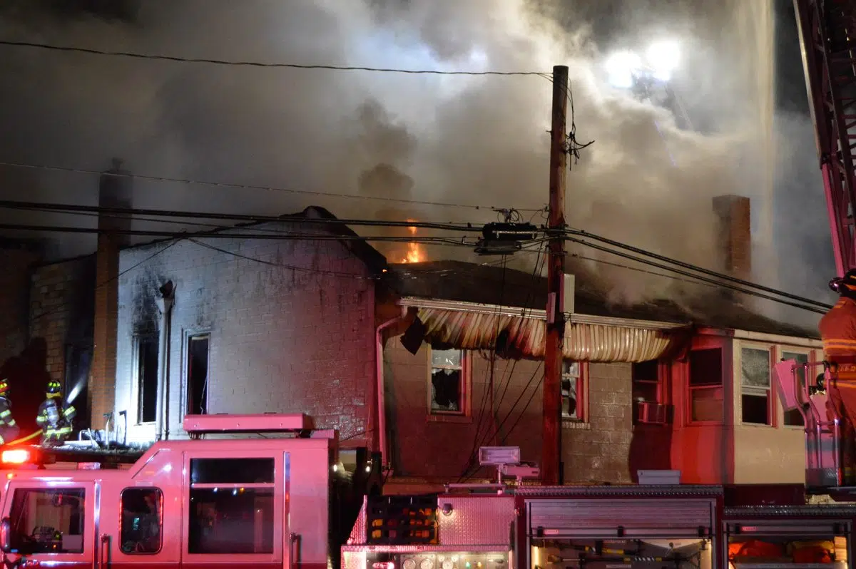 Fire crews continue to battle a blaze in downtown Blairsville. Fourteen fire companies from across the region were summoned at about five o’clock this morning to the Fox’s Pizza building a...