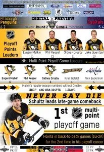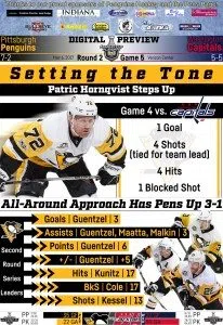 The Penguins host the Capitals tonight at 7:30 without the services of Sidney Crosby, ruled out with a concussion suffered in Game Three. Pittsburgh leads the series, 2-1. Pre-game tonight is at 6:30 ...