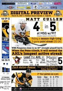 Attempting to snap a four-game losing streak, the Penguins take on the New York Rangers tonight in New York. The Pens hold the third spot in the Metropolitan Division, while the Rangers currently hold...