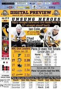 The Penguins visit the Ottawa Senators tonight at 7:30 p.m. Pittsburgh (46-17-9) trails first-place Washington by one point in the Metropolitan Division standings and is in position to leap frog the C...