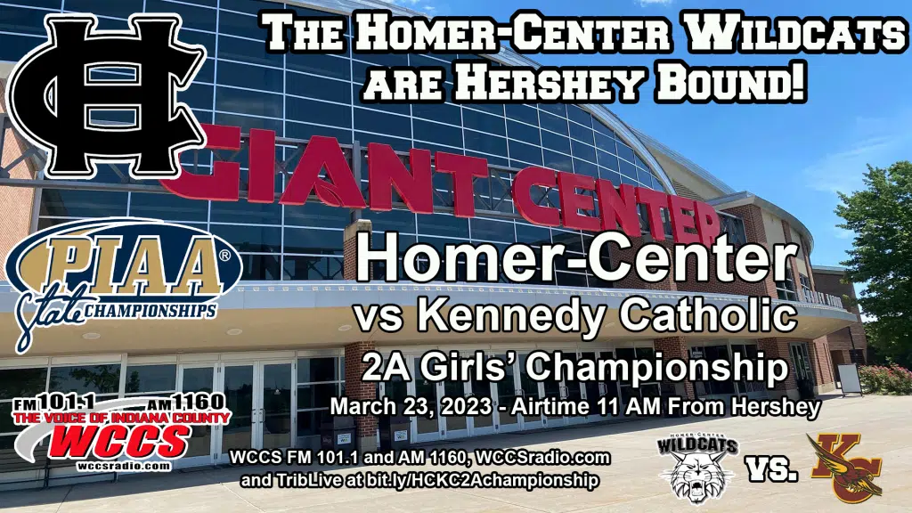 The Homer-Center Wildcats play for the PIAA 2A Girls’ Basketball Championship on Thursday, March 23, taking on Kennedy Catholic Eagles at the Giant Center in Hershey! Airtime is 11 am with WCCS FM 101.1 and AM 1160 and streaming audio at WCCSradio.com. You can also listen on the TribLive High School Sports Network (bit.ly/HCKC2Achampionship when it’s live).